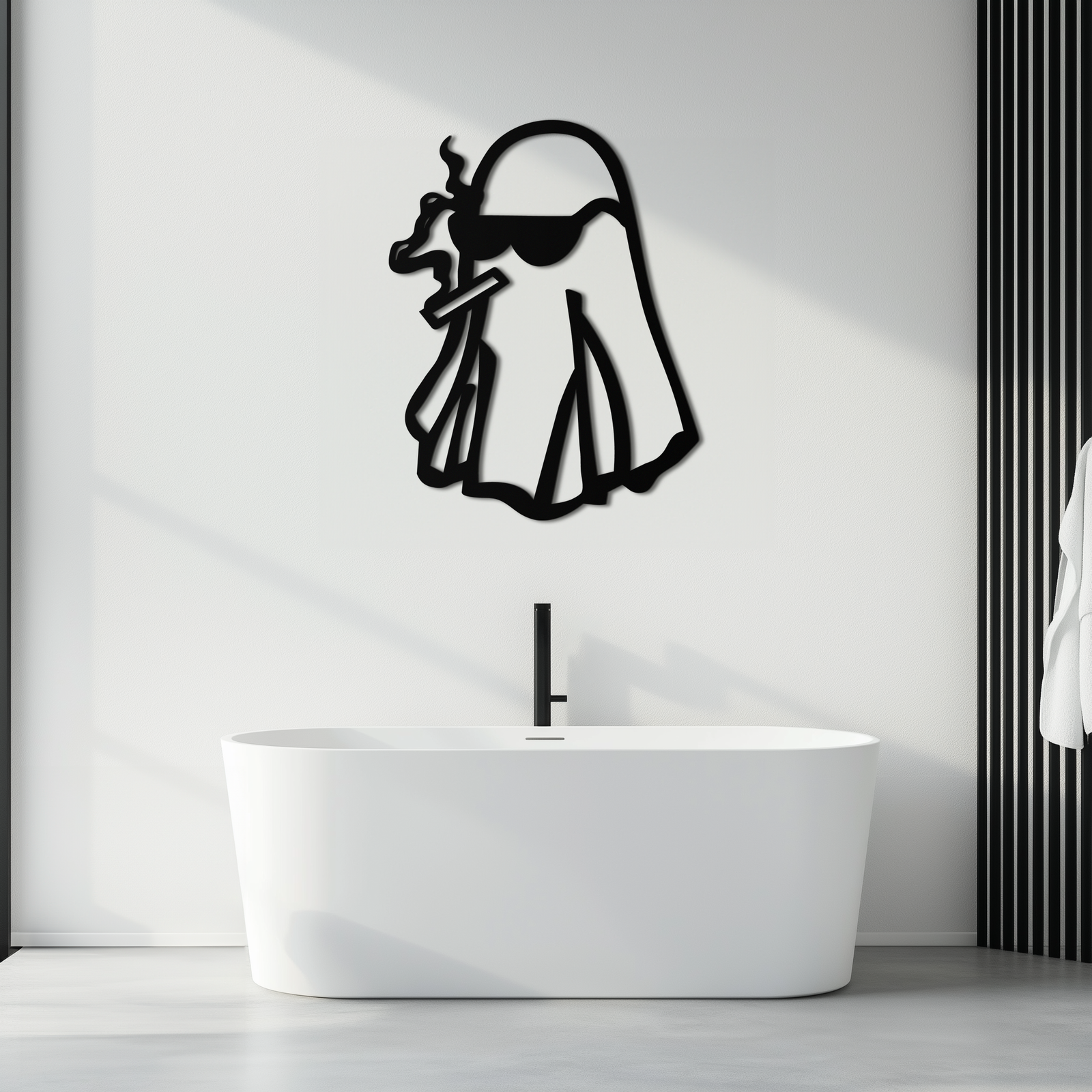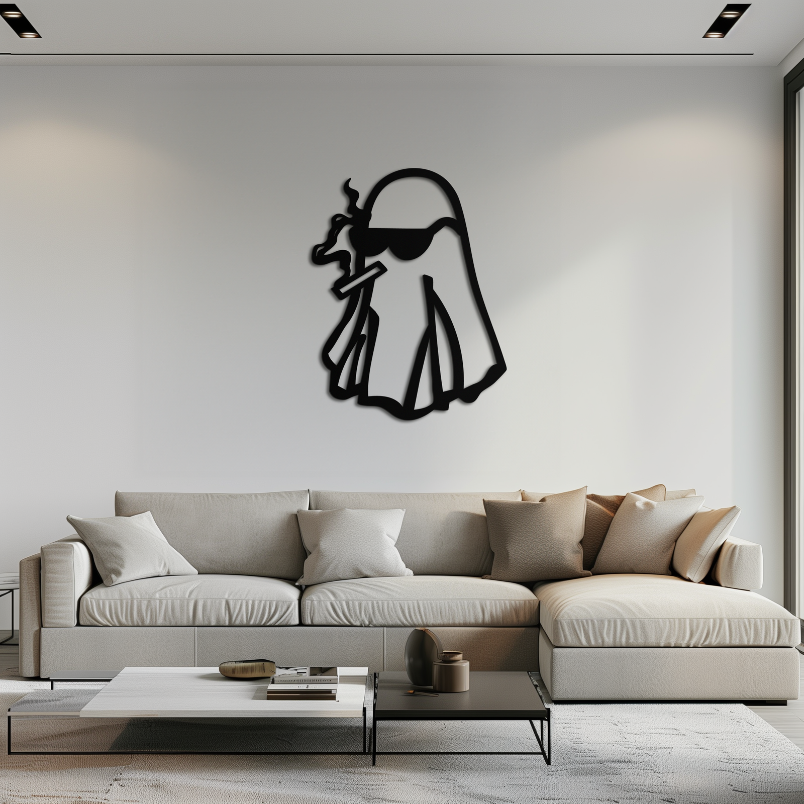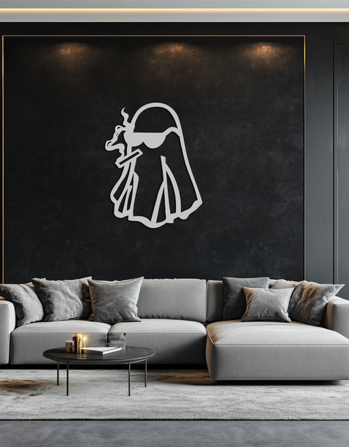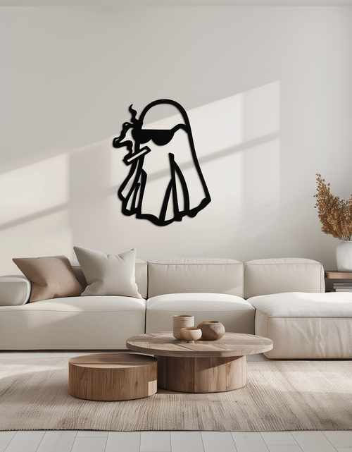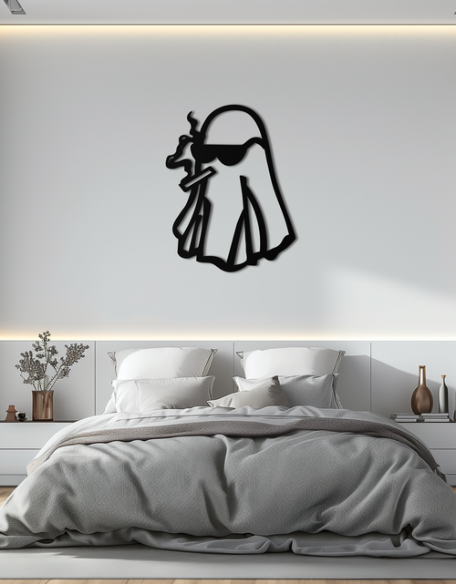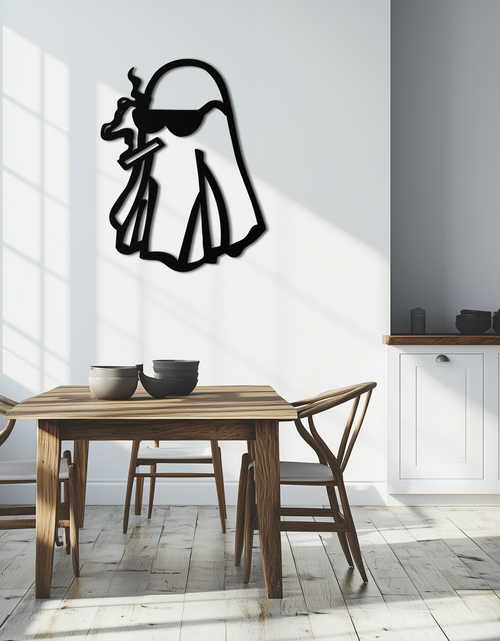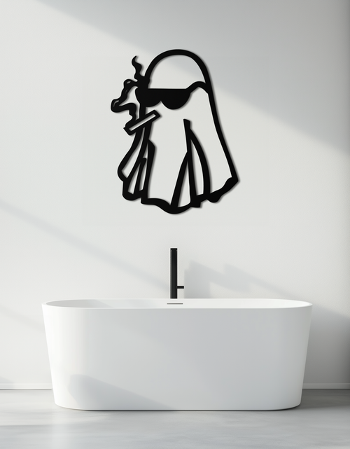 Add a rebellious twist to your space with this Cool Ghost Metal Wall Art featuring a ghost character in sunglasses and holding a smoking cigar. Designed for lovers of edgy and quirky aesthetics, this piece is laser-cut from 1.5 mm premium metal and finished with durable matte black electrostatic paint. Ideal for living rooms, dorms, or man caves.