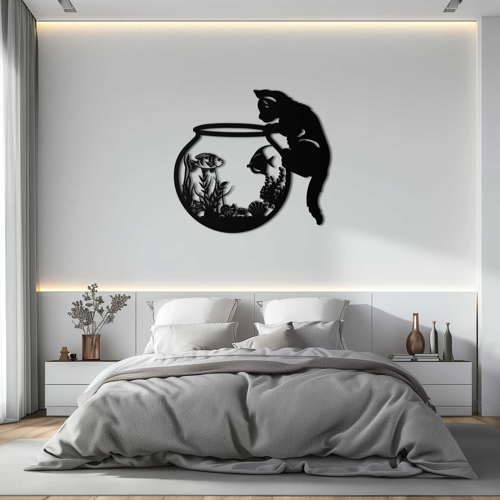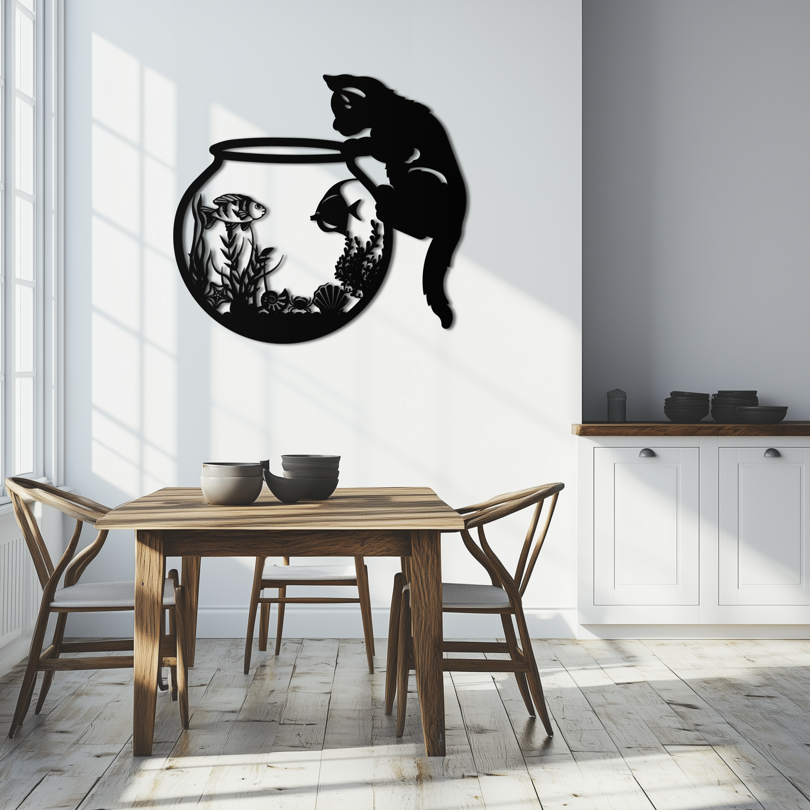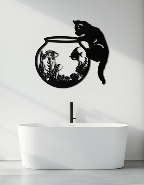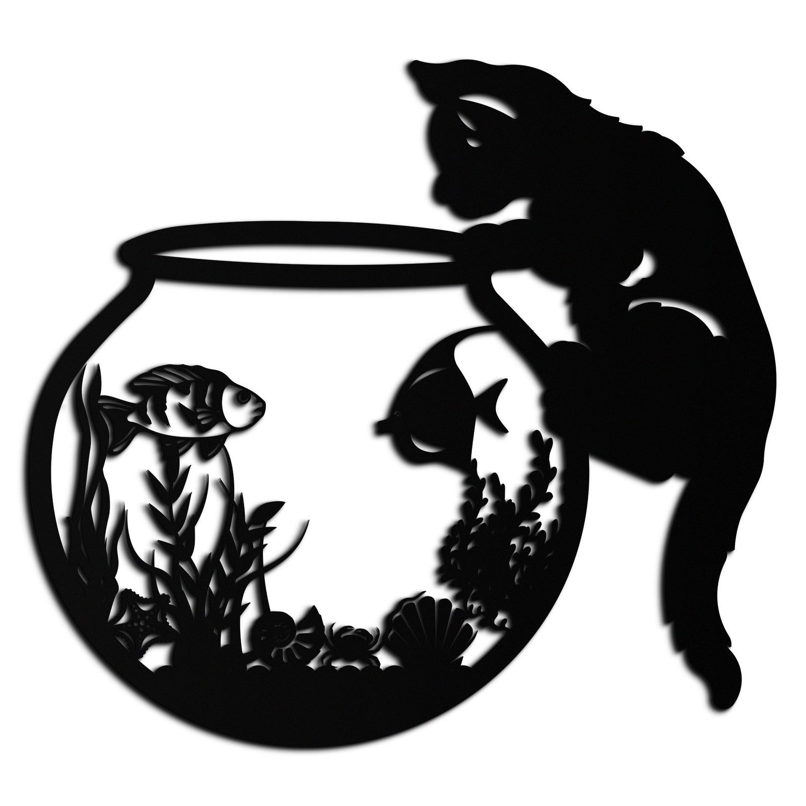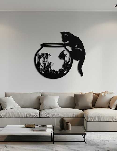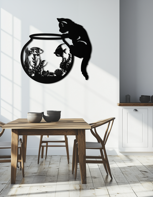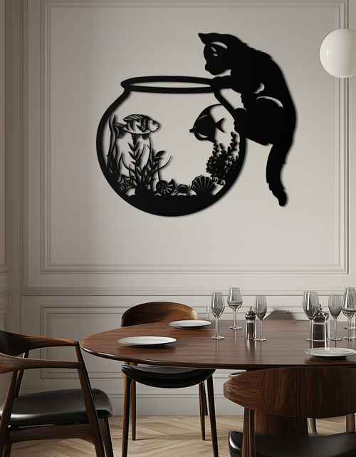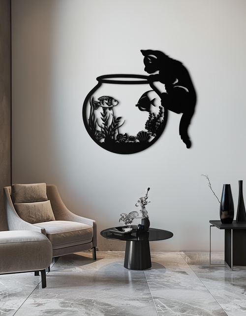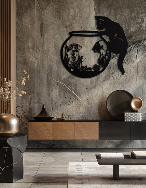 Curious Cat and Fishbowl Metal Wall Art - Playful Geometric Steel Decor - KAF135
