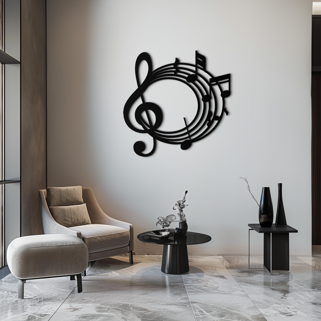 Celebrate your love for music with this Musical Notes Circle Metal Wall Art featuring a flowing staff, dynamic musical notes, and a central treble clef. Crafted from high-quality 1.5 mm metal with a sleek matte black finish, this piece brings artistic rhythm and harmony to your space. Perfect for music rooms, studios, or any creative environment, it adds a modern and melodic touch to any wall.