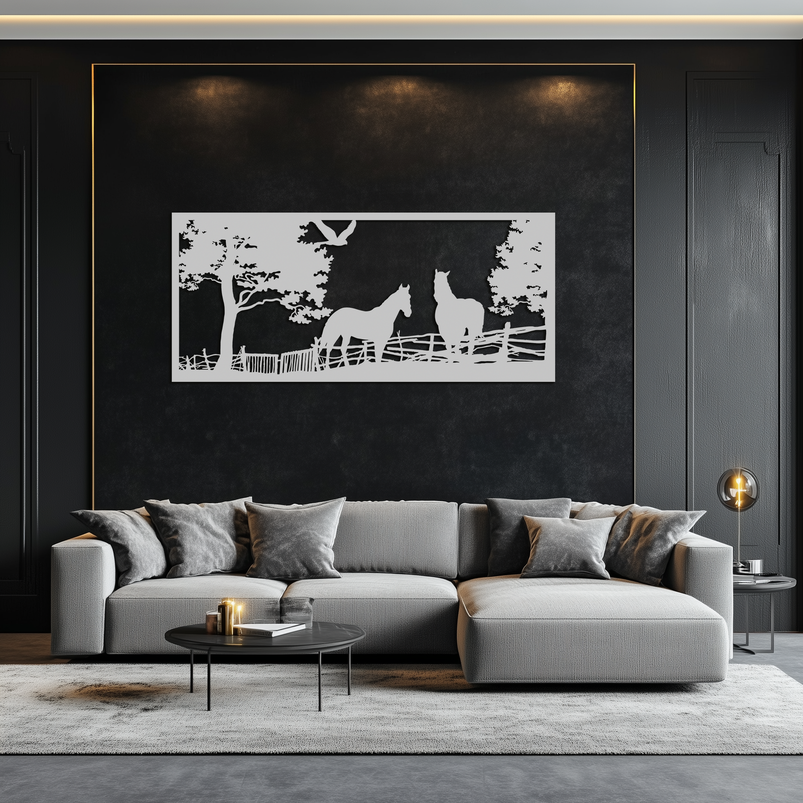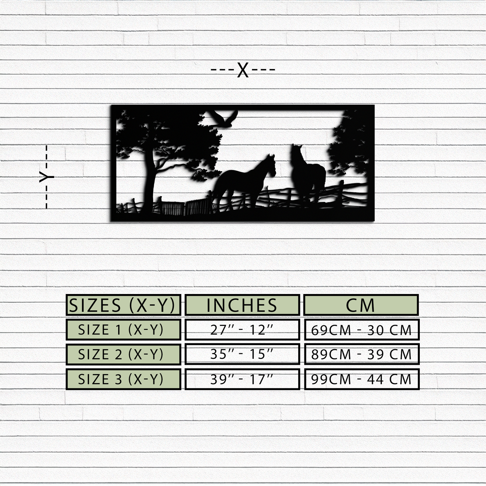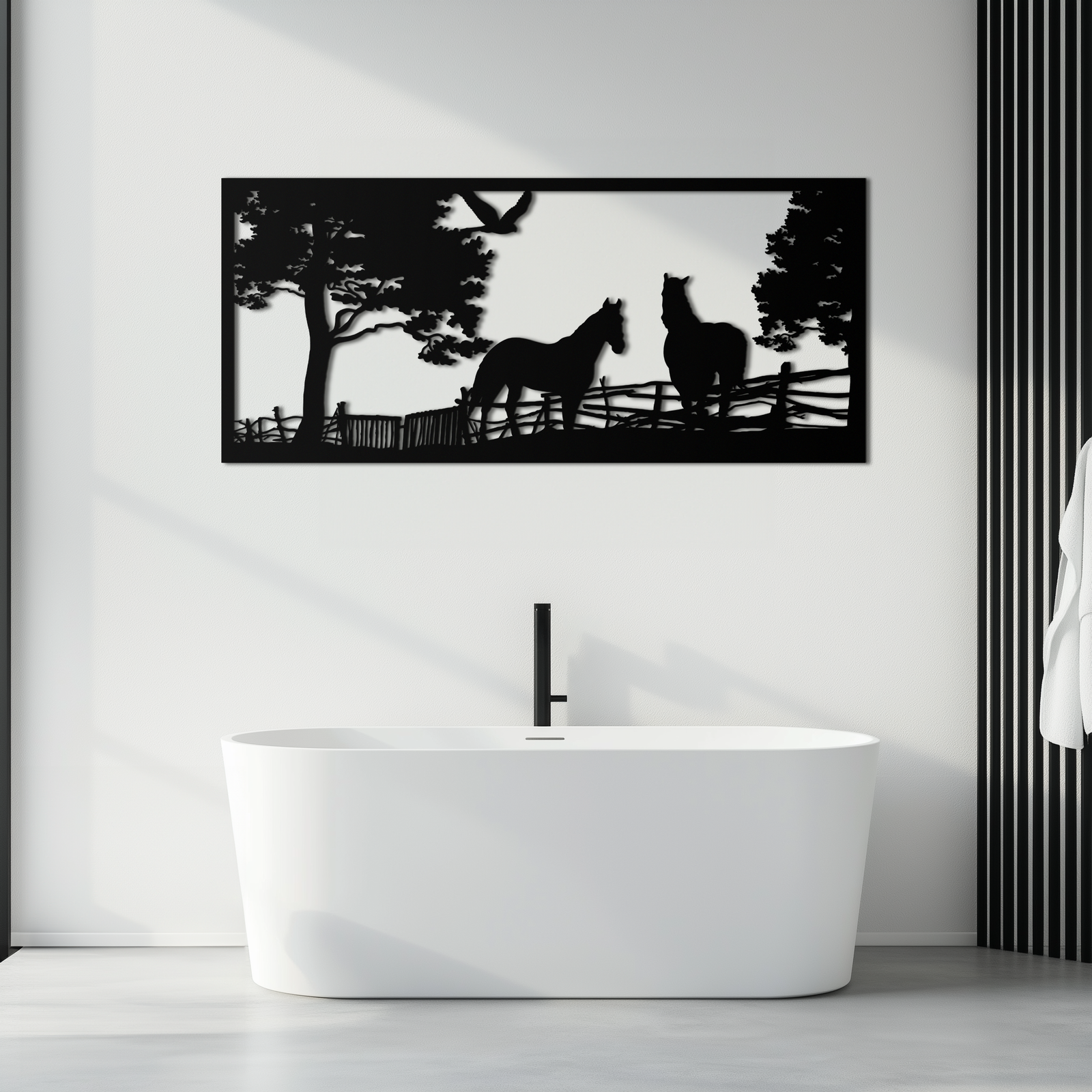 Bring the serenity of the countryside into your space with this Rustic Horse Farm Metal Wall Art. Crafted from 1.5mm premium steel, this stunning piece captures the peaceful beauty of horses in a farm setting. The electrostatically applied coating ensures a rust-resistant and fade-proof finish, making it suitable for both indoor and outdoor use.